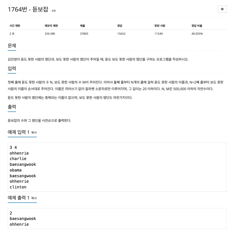 첫째 줄에 듣도 못한 사람의 수 N, 보도 못한 사람의 수 M이 주어진다. 이어서 둘째 줄부터 N개의 줄에 걸쳐 듣도 못한 사람의 이름과, N+2째 줄부터 보도 못한 사람의 이름이 순서대로 주어진다.