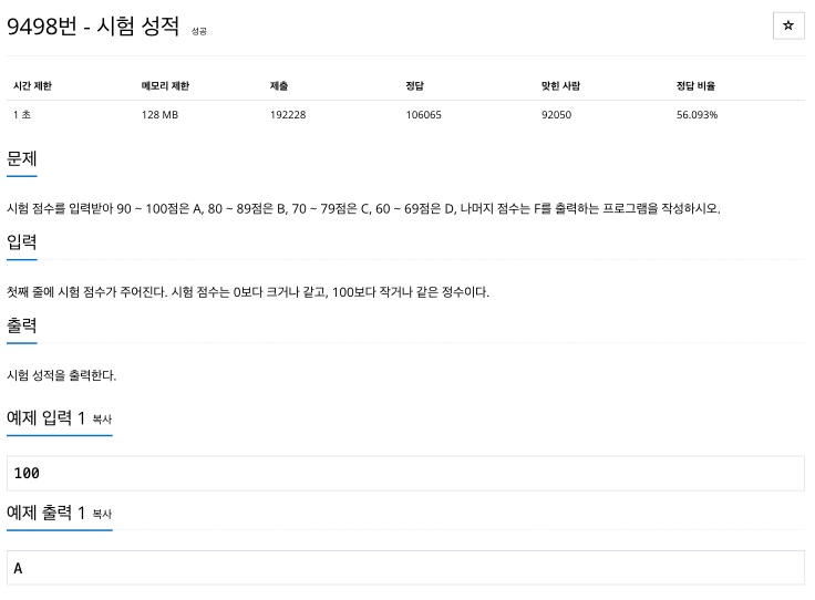 시험 점수를 입력받아 90 ~ 100점은 A, 80 ~ 89점은 B, 70 ~ 79점은 C, 60 ~ 69점은 D, 나머지 점수는 F를 출력하는 프로그램을 작성하시오.