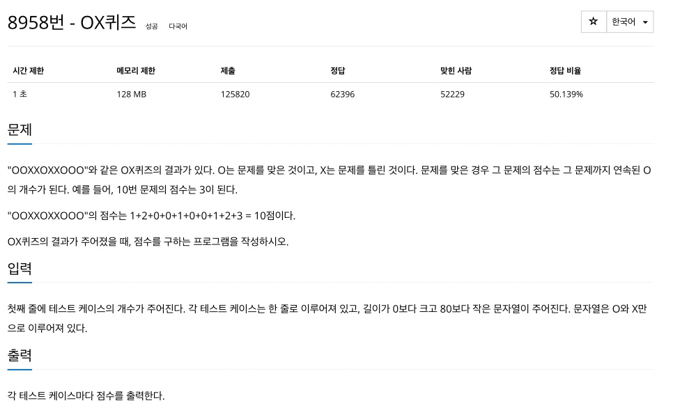 "OOXXOXXOOO"와 같은 OX퀴즈의 결과가 있다. O는 문제를 맞은 것이고, X는 문제를 틀린 것이다. 문제를 맞은 경우 그 문제의 점수는 그 문제까지 연속된 O의 개수가 된다. 예를 들어, 10번 문제의 점수