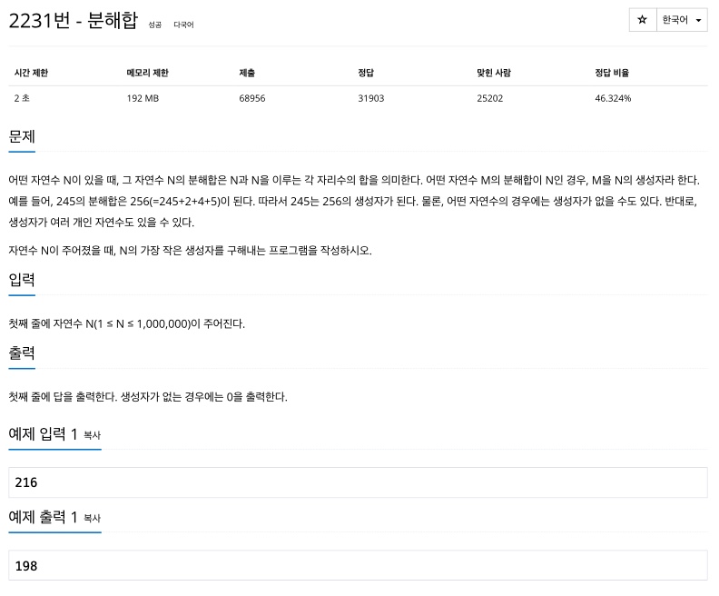어떤 자연수 N이 있을 때, 그 자연수 N의 분해합은 N과 N을 이루는 각 자리수의 합을 의미한다. 어떤 자연수 M의 분해합이 N인 경우, M을 N의 생성자라 한다. 예를 들어, 245의 분해합은 256(=245+2+4+5)이