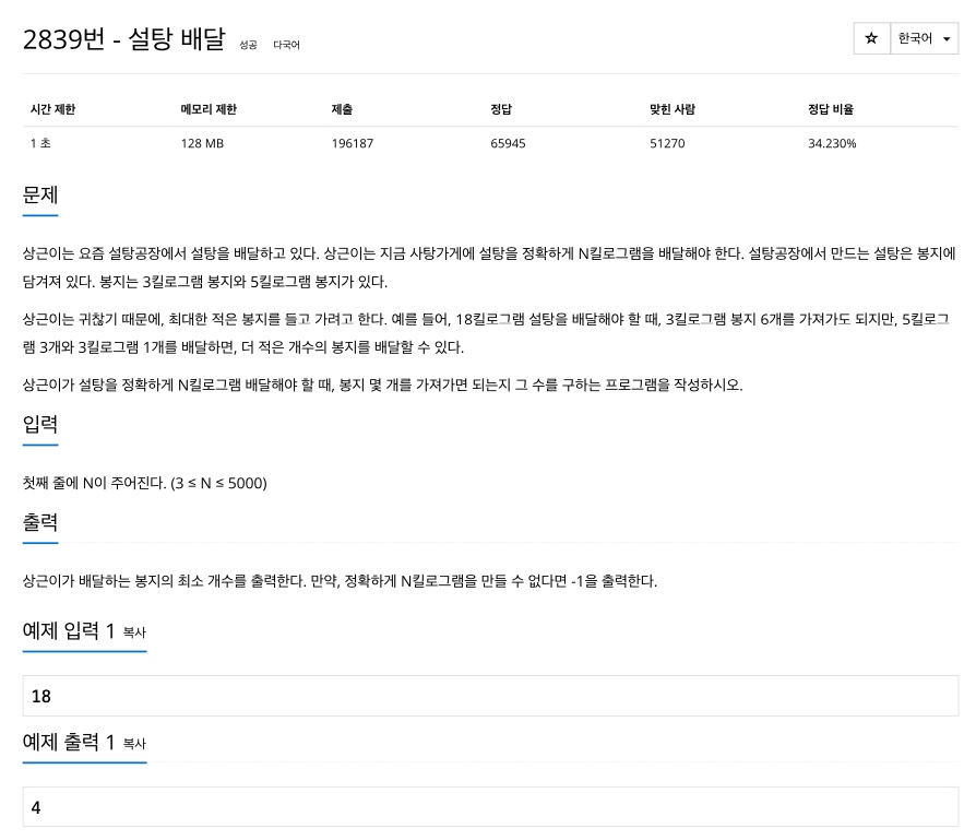 상근이는 요즘 설탕공장에서 설탕을 배달하고 있다. 상근이는 지금 사탕가게에 설탕을 정확하게 N킬로그램을 배달해야 한다. 설탕공장에서 만드는 설탕은 봉지에 담겨져 있다. 봉지는 3킬로그