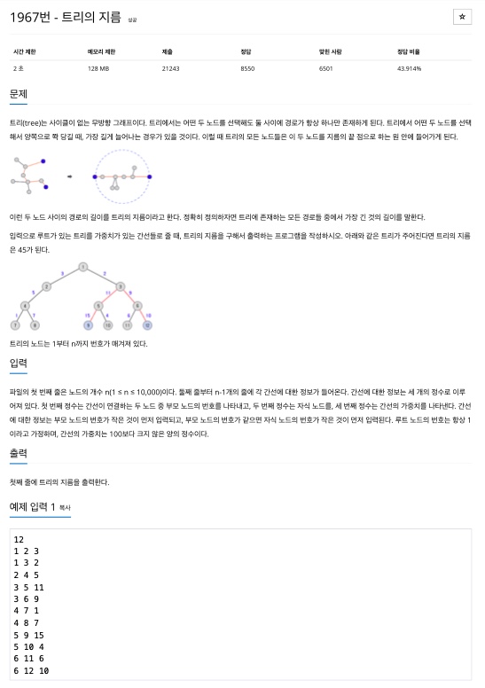 파일의 첫 번째 줄은 노드의 개수 n(1 ≤ n ≤ 10,000)이다. 둘째 줄부터 n-1개의 줄에 각 간선에 대한 정보가 들어온다. 간선에 대한 정보는 세 개의 정수로 이루어져 있다. 첫 번째 정수는 간선이 연