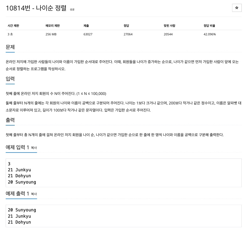 온라인 저지에 가입한 사람들의 나이와 이름이 가입한 순서대로 주어진다. 이때, 회원들을 나이가 증가하는 순으로, 나이가 같으면 먼저 가입한 사람이 앞에 오는 순서로 정렬하는 프로그램을