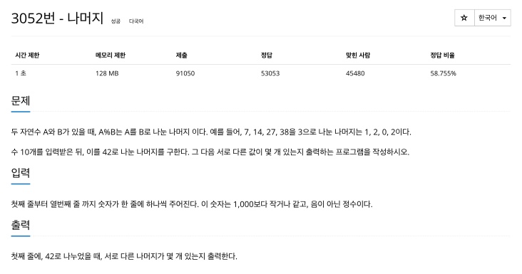 [Python]백준 BaekJoon.AC 3052 : 나머지(list, set)