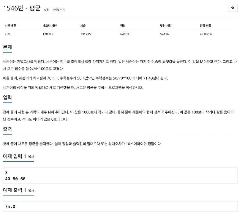 [Python]백준 BaekJoon.AC 1546 : 평균(list, sort())