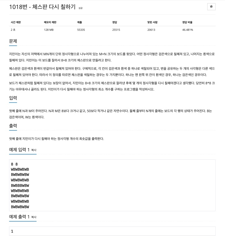 첫째 줄에 N과 M이 주어진다. N과 M은 8보다 크거나 같고, 50보다 작거나 같은 자연수이다. 둘째 줄부터 N개의 줄에는 보드의 각 행의 상태가 주어진다. B는 검은색이며, W는 흰색이다.